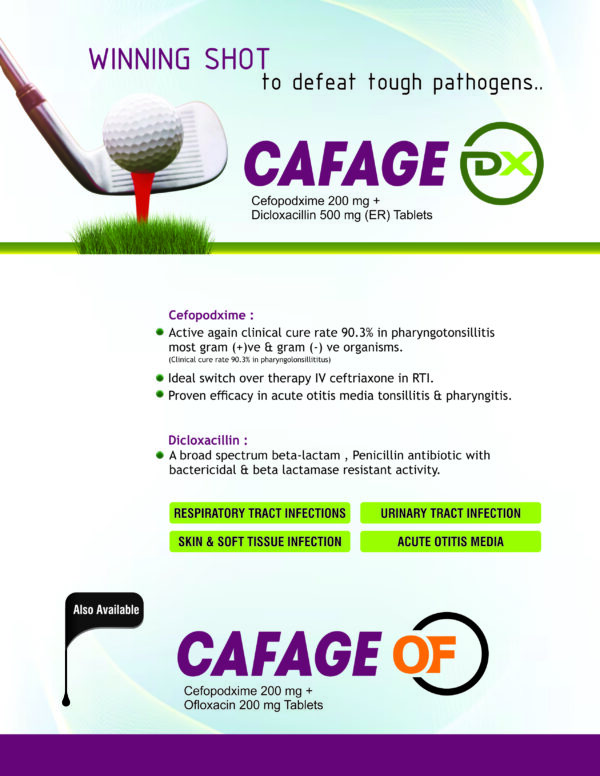 CAFAGE™ is a broad-spectrum antibiotic range formulated with Cefpodoxime Proxetil, Ceftriaxone, Sulbactam, Tazobactam, Clavulanic Acid, and Ofloxacin. These powerful formulations are designed to treat bacterial infections of the respiratory tract, urinary system, skin, and soft tissues. The combination products enhance antibiotic efficacy by inhibiting bacterial resistance mechanisms, ensuring faster and more effective results.