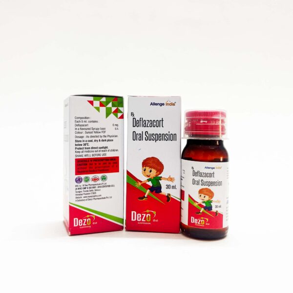 DEZO Syrup & Tablets contain Deflazacort, a glucocorticoid with strong anti-inflammatory and immunosuppressive properties. It is widely used to treat various inflammatory, allergic, and autoimmune conditions, providing rapid relief from swelling, pain, and immune-related disorders.