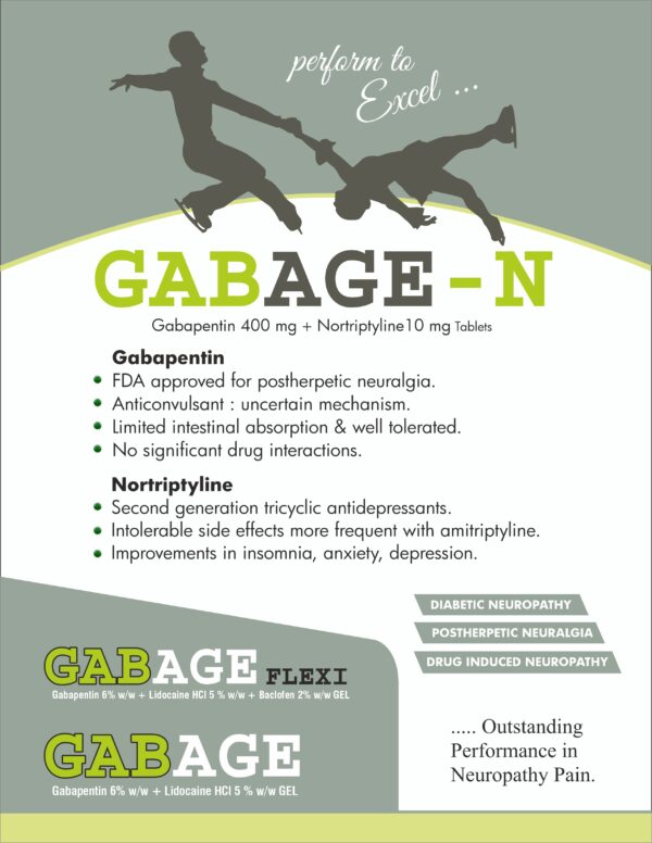 GABAGE™-N Tablets: A dual-action oral therapy containing Gabapentin (400 mg) and Nortriptyline (10 mg) to control chronic nerve pain, enhance nerve function, and reduce discomfort caused by neuropathy.