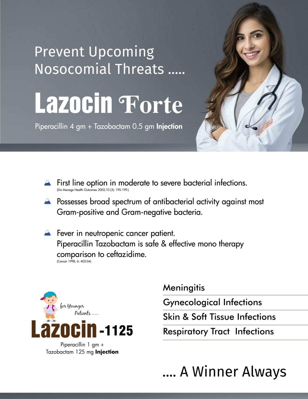 LAZOCIN is a broad-spectrum antibiotic that contains Cefuroxime, a second-generation cephalosporin, and Piperacillin-Tazobactam, a powerful beta-lactam combination. It is used to treat a wide range of bacterial infections by inhibiting bacterial cell wall synthesis, leading to bacterial death.